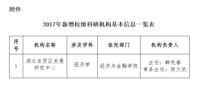 今日,77779193永利官网公布新增一校级科研机构。我院申报的“湖北自贸区发展研究中心”基地项目通过审核。韩民春副校长为机构负责人。本研究中心将主要从贸易方式创新升级研究、武汉科技金融的开放创新及风险监管研究及长江中游国际物流枢纽建设研究三个方面展开。