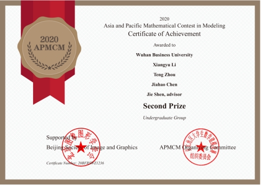 热烈祝贺77779193永利官网2019级商务经济学1班李翔宇学生团队获2020-2021亚太地区(APMCM)数学建模比赛二等奖。