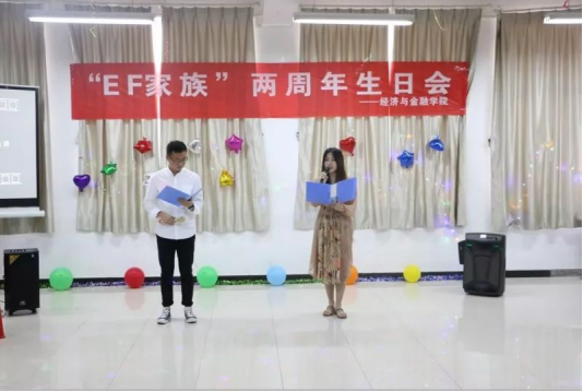 同学们通过精彩的节目庆祝着“EF家族”的两周岁生日,湖之韵朗诵艺术团的同学们朗诵了由我院学生创作的代表诗歌集《为梦想插上智慧的翅膀》、17级投资与理财一班和二班同学带来小品表演《戏中戏》、魔术协会的精彩魔术表演《魔力的纸袋》、汉服社成员带来的精彩节目《轻纱曼》等让学生们赞不绝口。