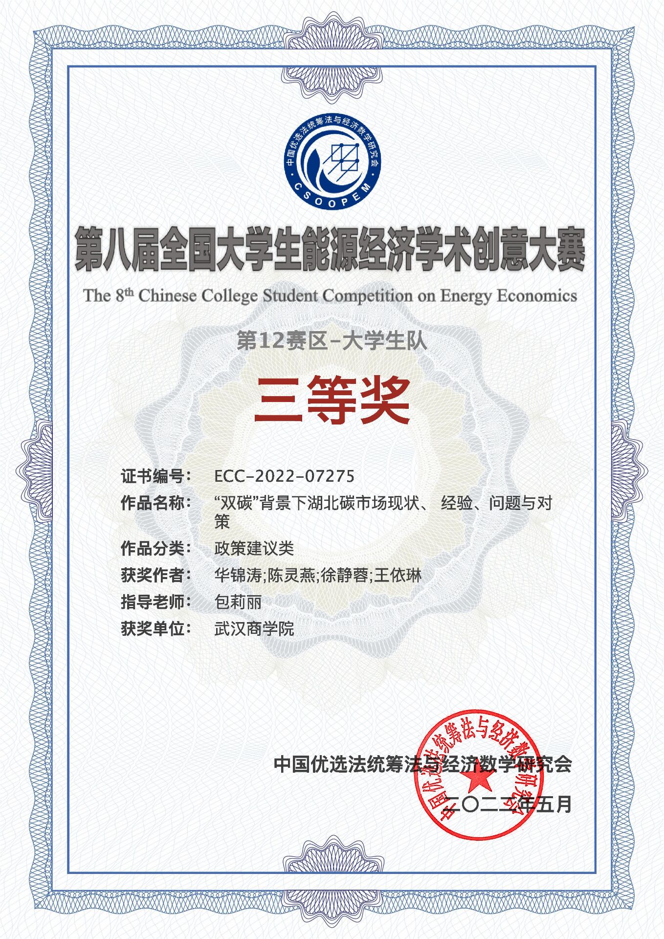 我院经济统计学2021级新生华锦涛、陈灵燕、徐静蓉和王依琳获得2022年第八届全国大学生能源经济学术创意大赛省赛三等奖。在该系包莉丽老师的指导下,四名学生提交的政策建议类作品《“双碳”背景下湖北碳市场现状、经验、问题与对策》成功获得湖北省三等奖。