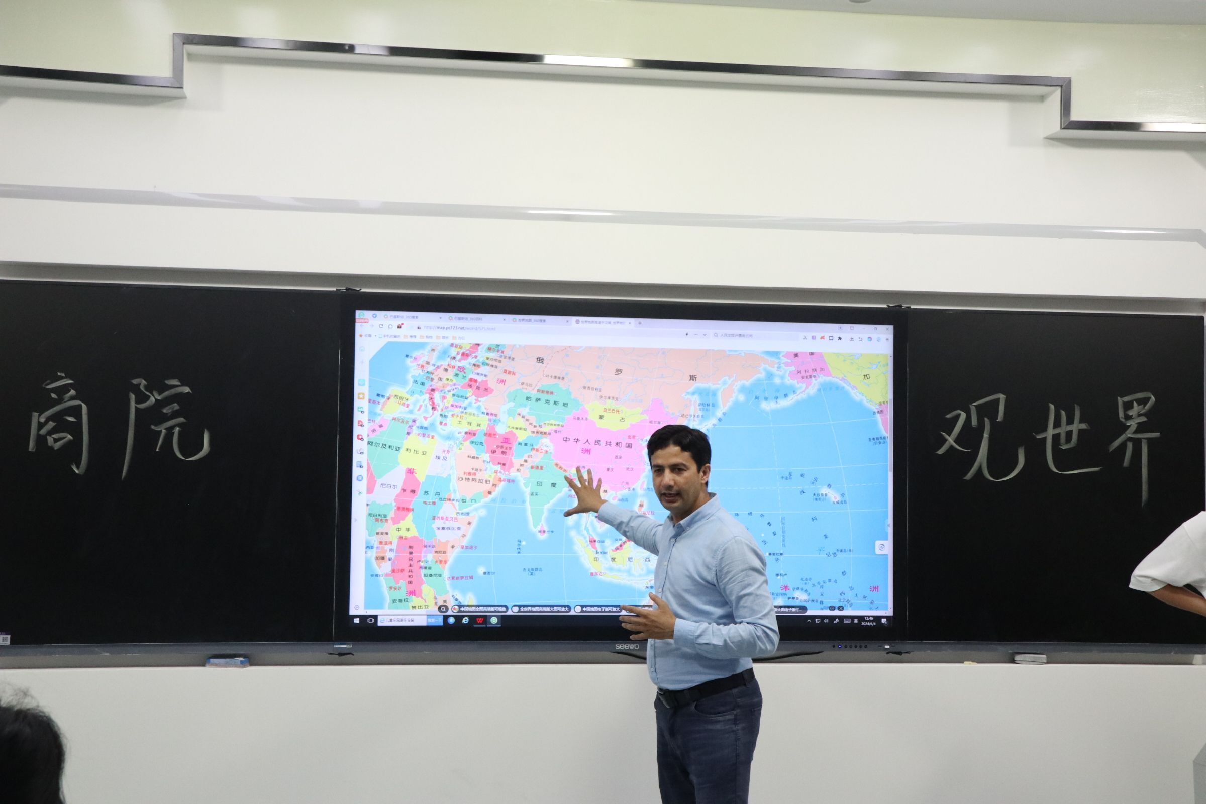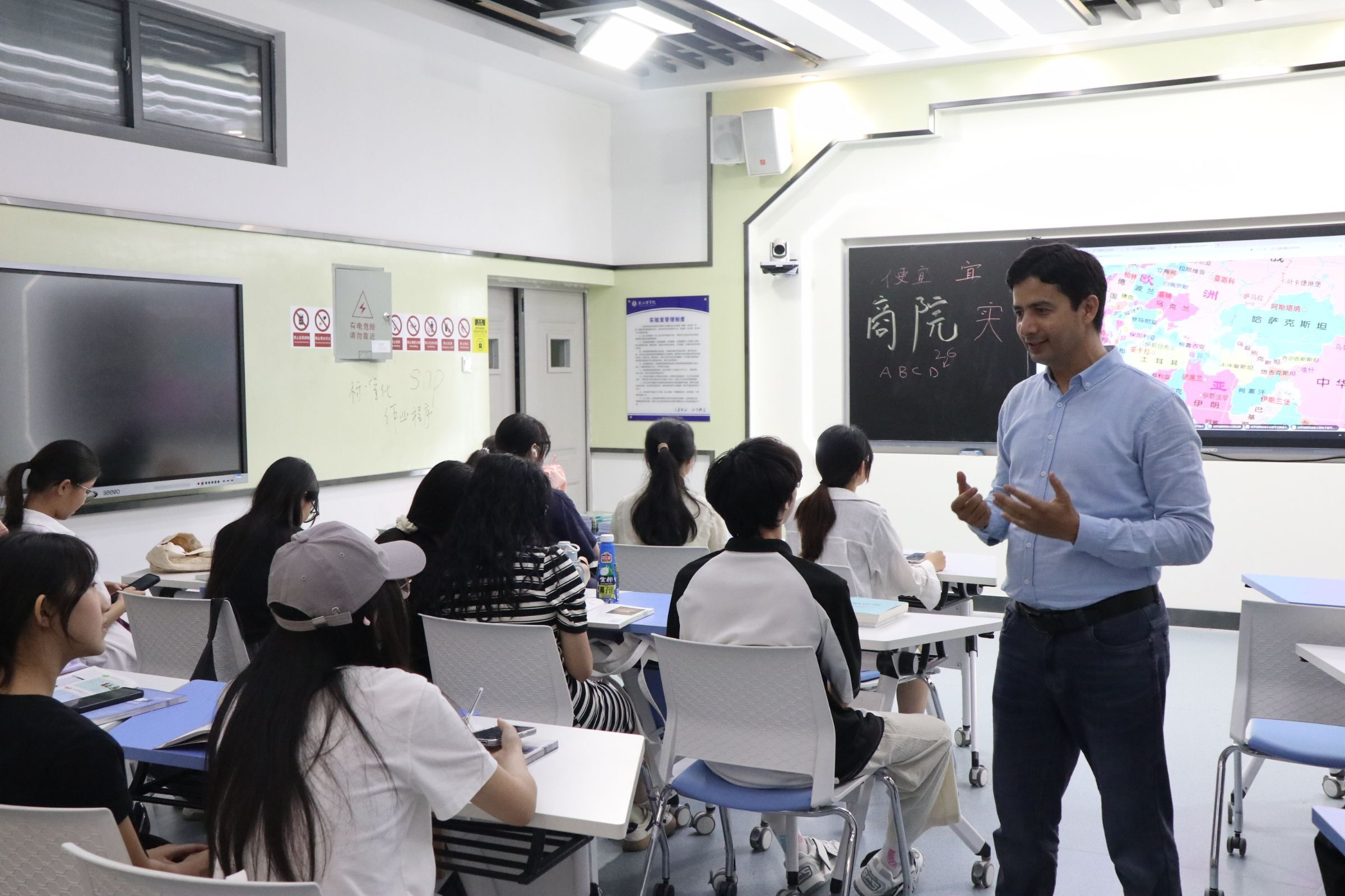 在授课之前,Nasir老师询问学生们感兴趣的国家。学生们纷纷踊跃发言,描述自己了解的国家,Nasir老师则在一旁耐心的补充,现场一片欢声笑语。